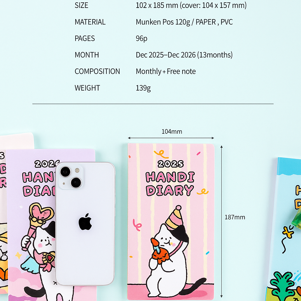 This adorable Handy Diary features a playful cat character series illustrated with a warm, cozy tone. Each cover design captures a different daily mood — from “Wanted Cat” to “Chill Mode” — making it as fun to collect as it is to use.