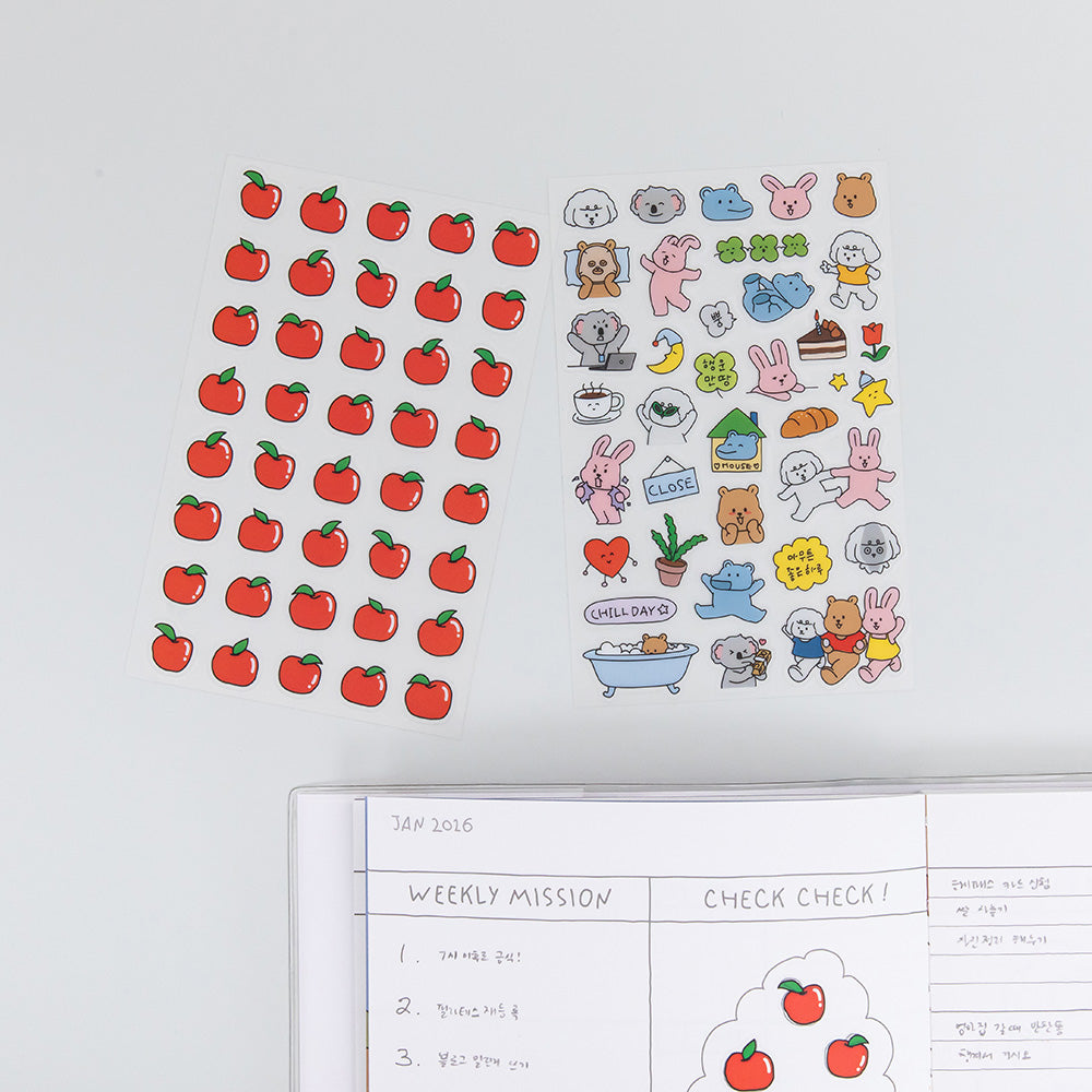 Includes two bonus sticker sheets (character + apple design 🍎)