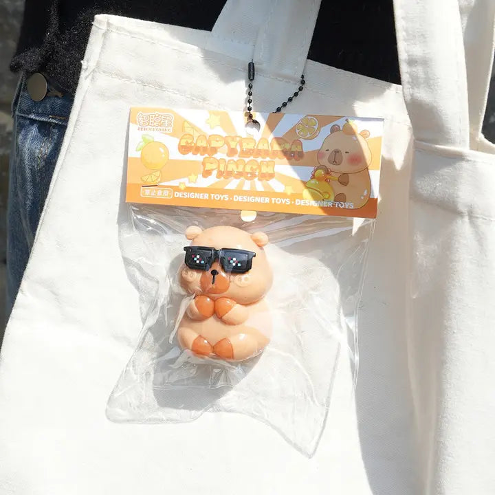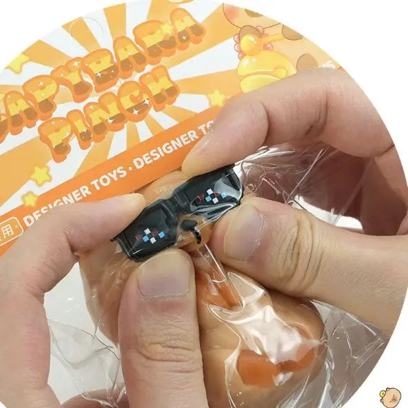 Add a burst of citrusy fun to your day with this adorable capybara squishy! With its cool pixelated sunglasses and relaxed expression, this soft and slow-rising stress toy is perfect for squeezing your worries away. The packaging features a playful orange juice theme, making it an eye-catching gift or collectible for designer toy lovers.