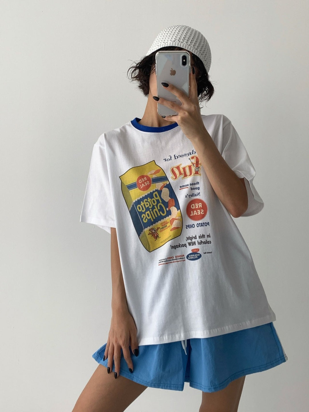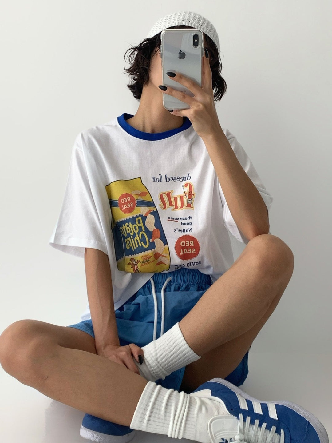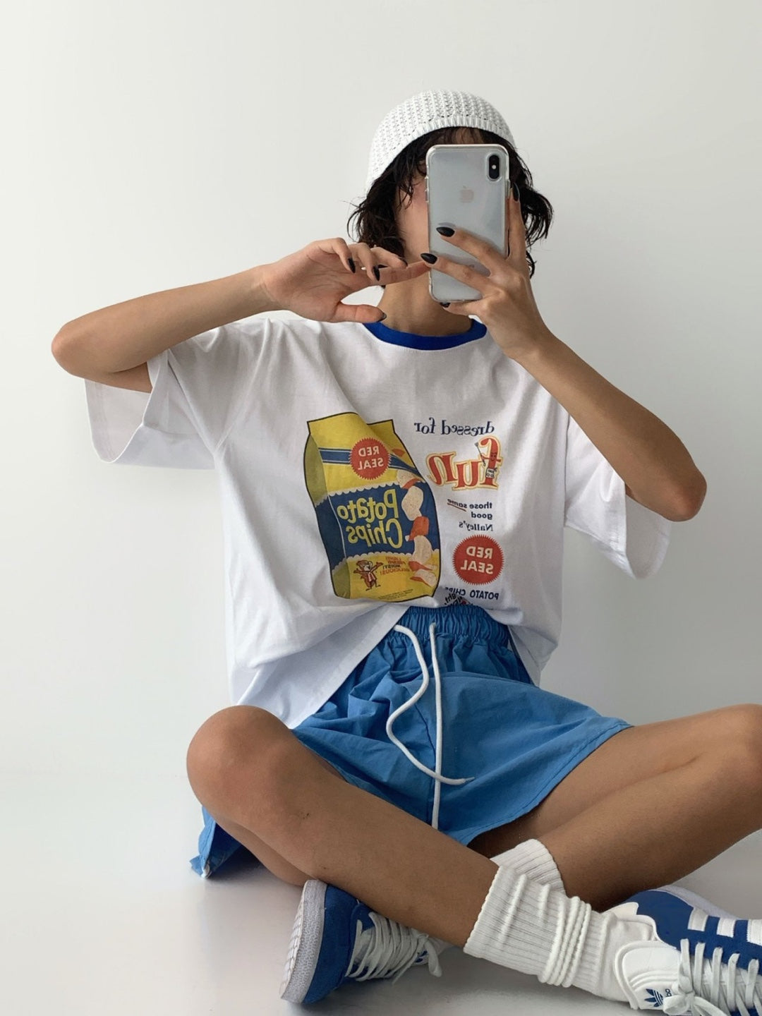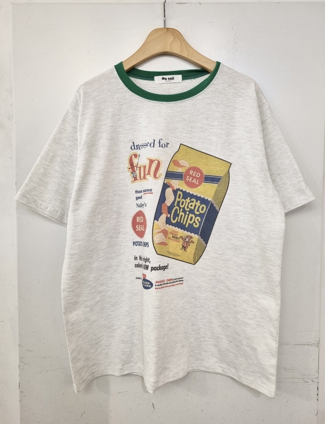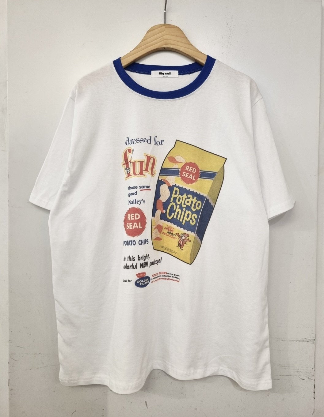 Add a pop of retro charm to your everyday look with this Vintage Snack Graphic Ringer T-Shirt. Featuring a playful potato chips print inspired by old-school packaging, this tee brings nostalgic vibes with a modern twist. The green contrast collar adds a sporty touch, making it perfect for casual styling.
