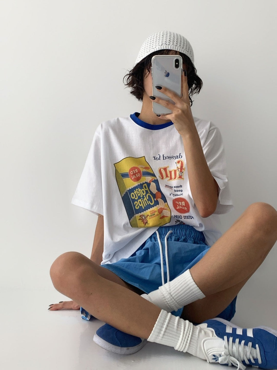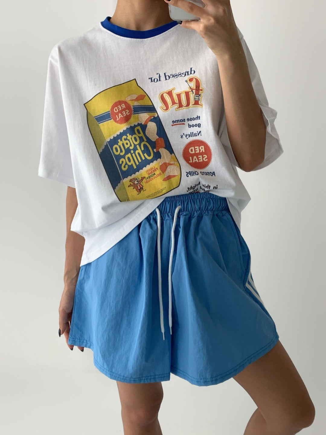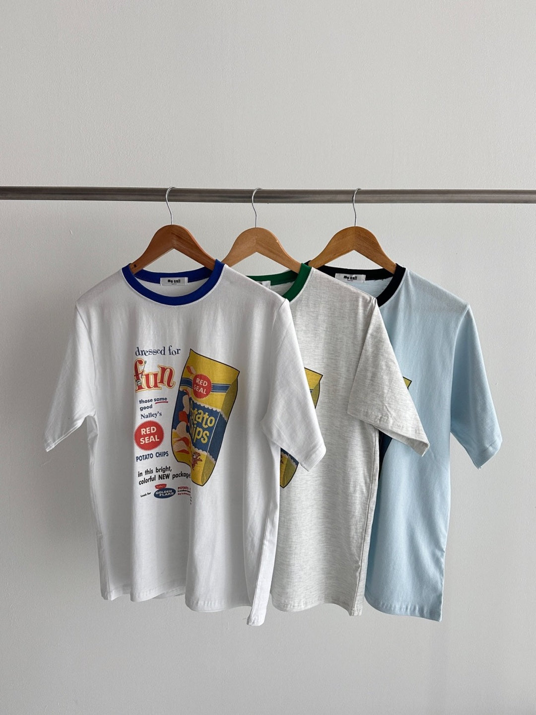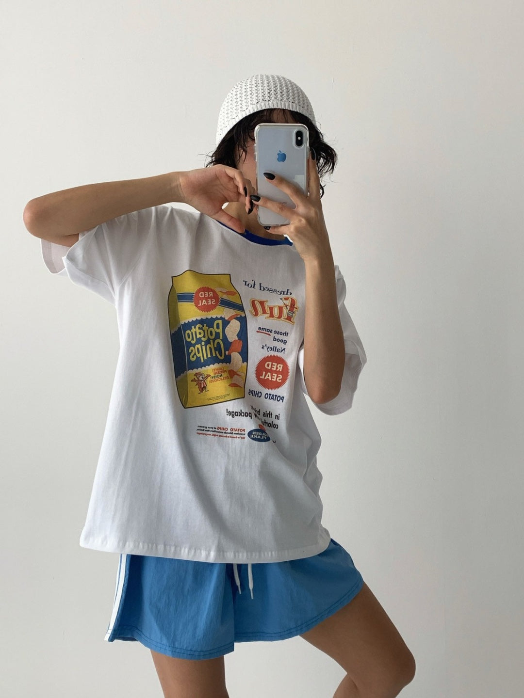 Add a pop of retro charm to your everyday look with this Vintage Snack Graphic Ringer T-Shirt. Featuring a playful potato chips print inspired by old-school packaging, this tee brings nostalgic vibes with a modern twist. The green contrast collar adds a sporty touch, making it perfect for casual styling.